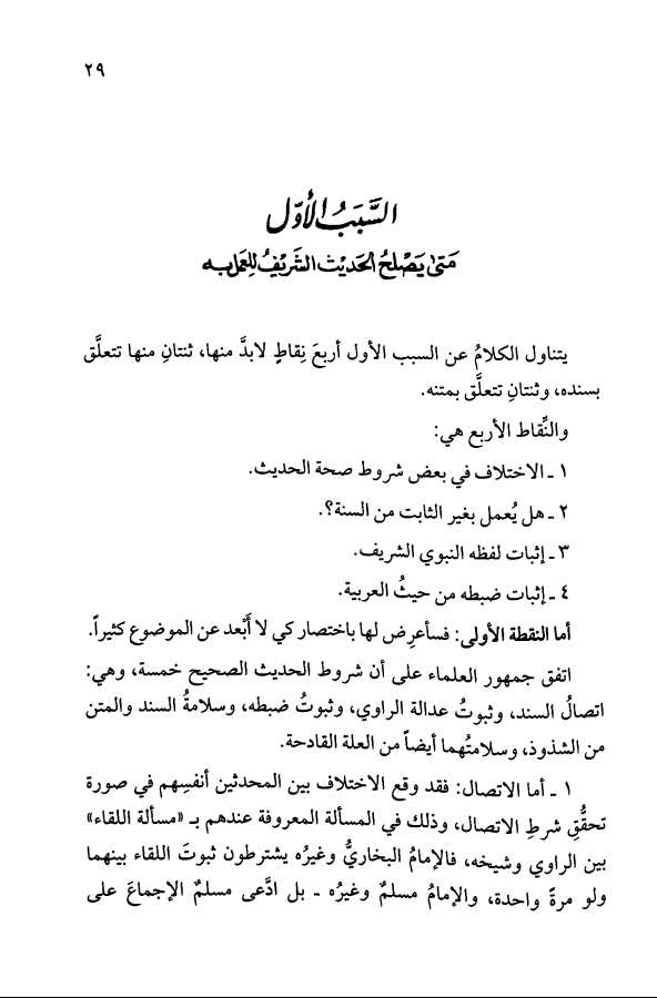 ثم عرض المؤلف أربعة أسباب مفصَّلة : الأول : متى يصلح الحديث الشريف للعمل به ؟