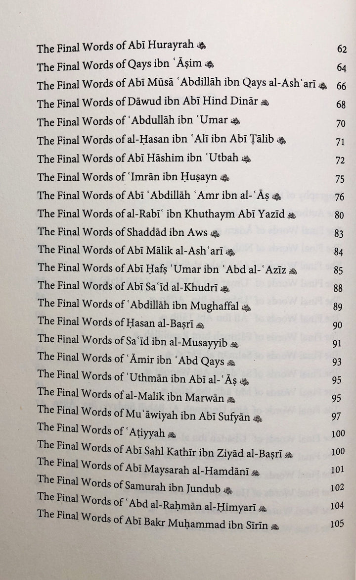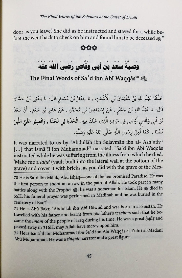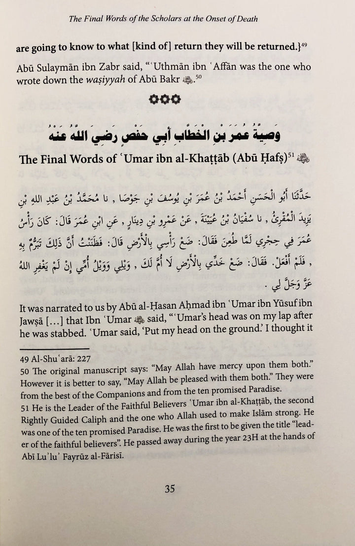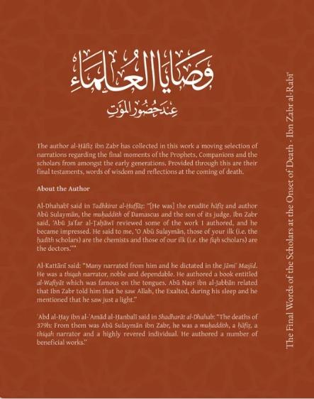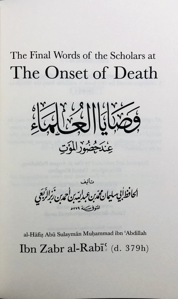 The Final Words of the Scholars at the Onset of Death is an English translation of the Arabic work وَصَايَا العُلَمَاءِ عِنْدَ حُضُوْرِ الموت / Wasāyā Al-'Ulemā 'Inda Hudhur Al-Mawt, compiled by al-Ḥāfiẓ ibn Zabr al-Rabi, an erudite scholar of Hadith from the fourth century Hijri.