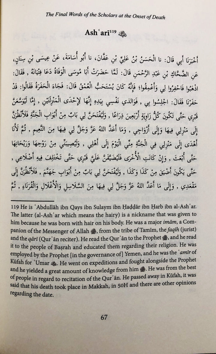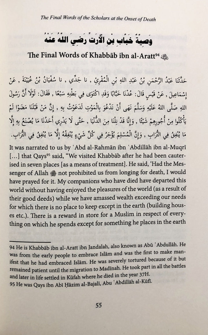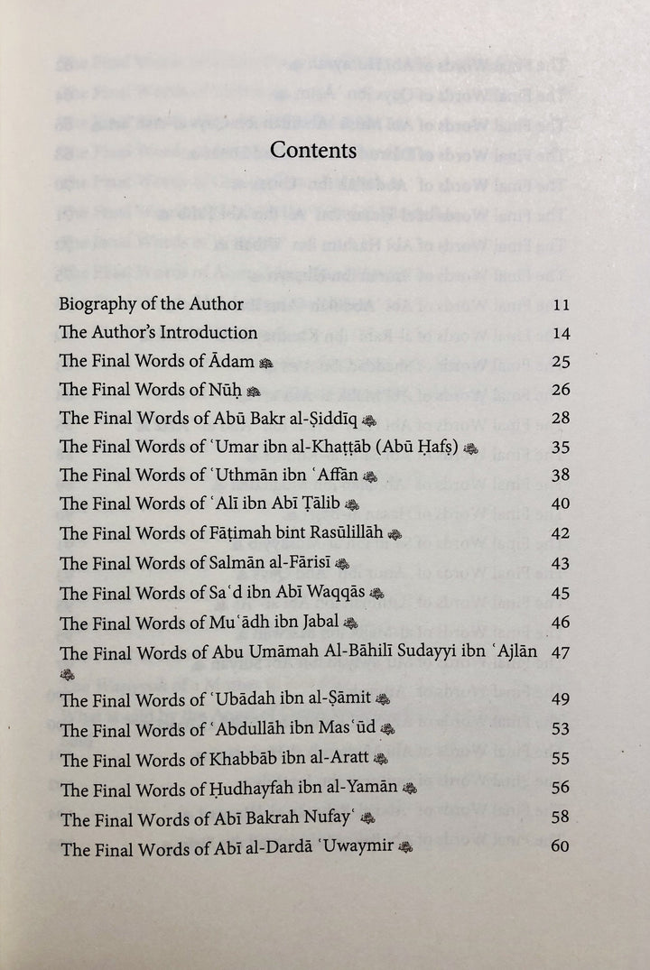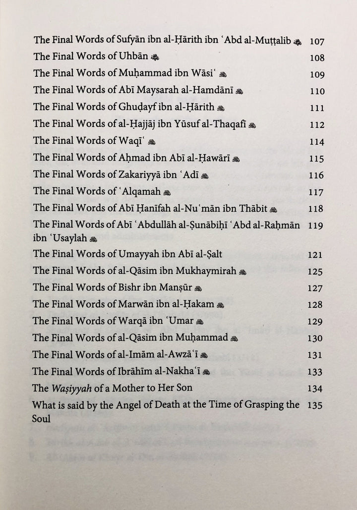 The author has collected in this work a moving selection of narrations regarding the final moments of the Prophets, Companions and the scholars from amongst the early generations. Provided through this are their final testaments, words of wisdom and reflections at the coming of death.