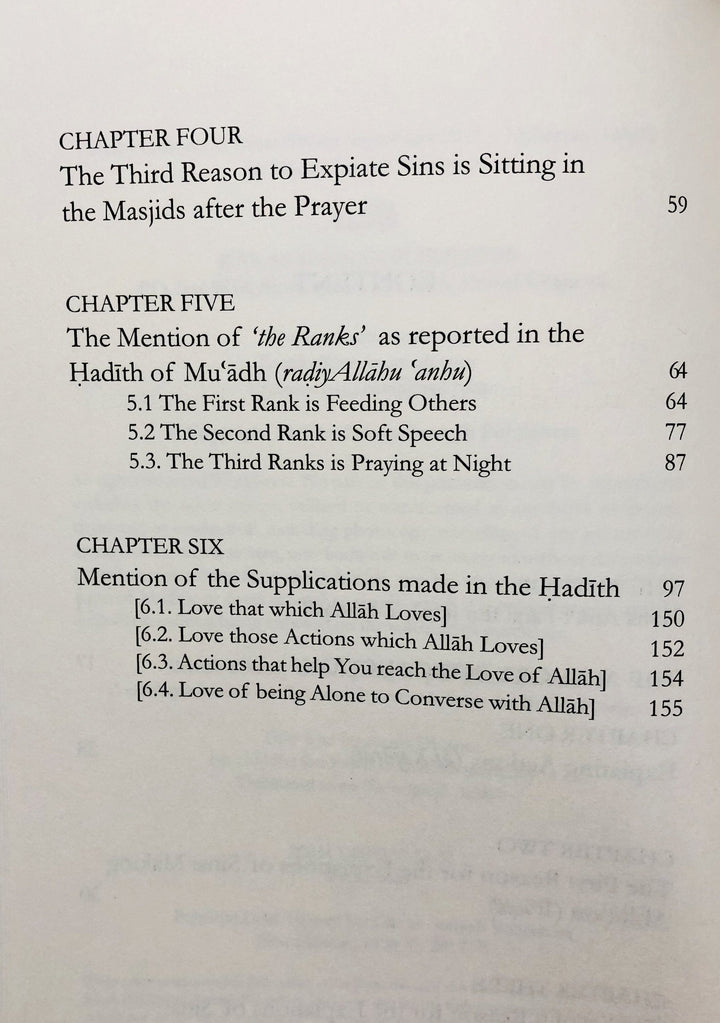 He additionally discuses concepts of dreams and miracles, the excellence of ablution and performing it well, performing prayer in congregation, the night prayer, walking to the Masjid, feeding the poor and one's neighbours, right etiquette in speaking, having humility and contentment, enjoining the love of Allah and increasing it for purpose of drawing closer to Him.