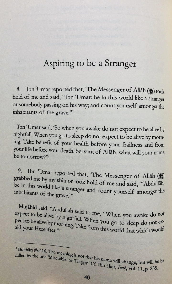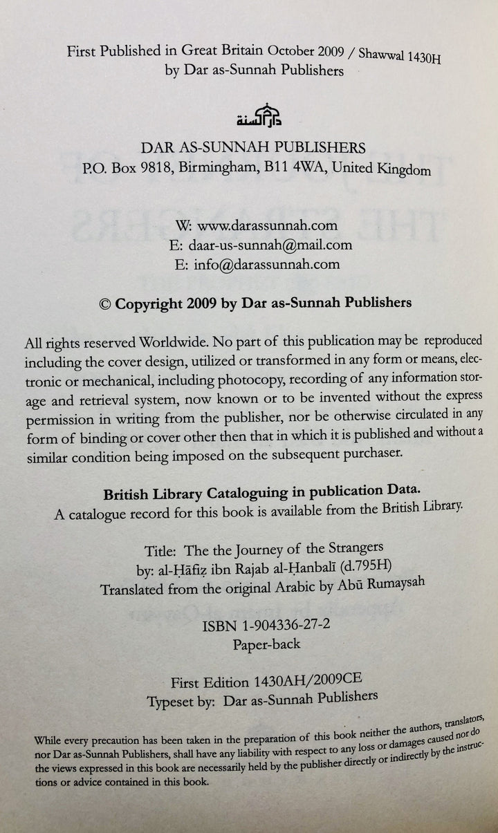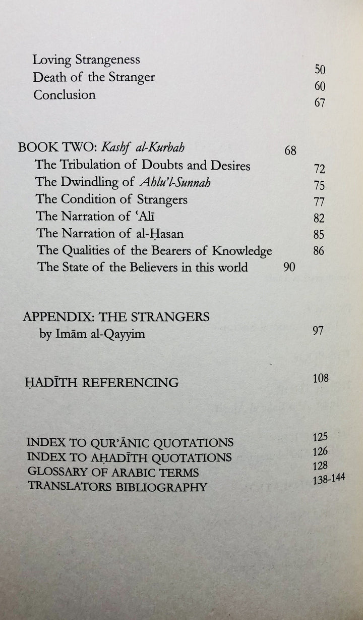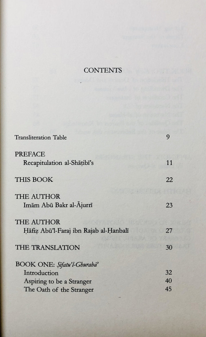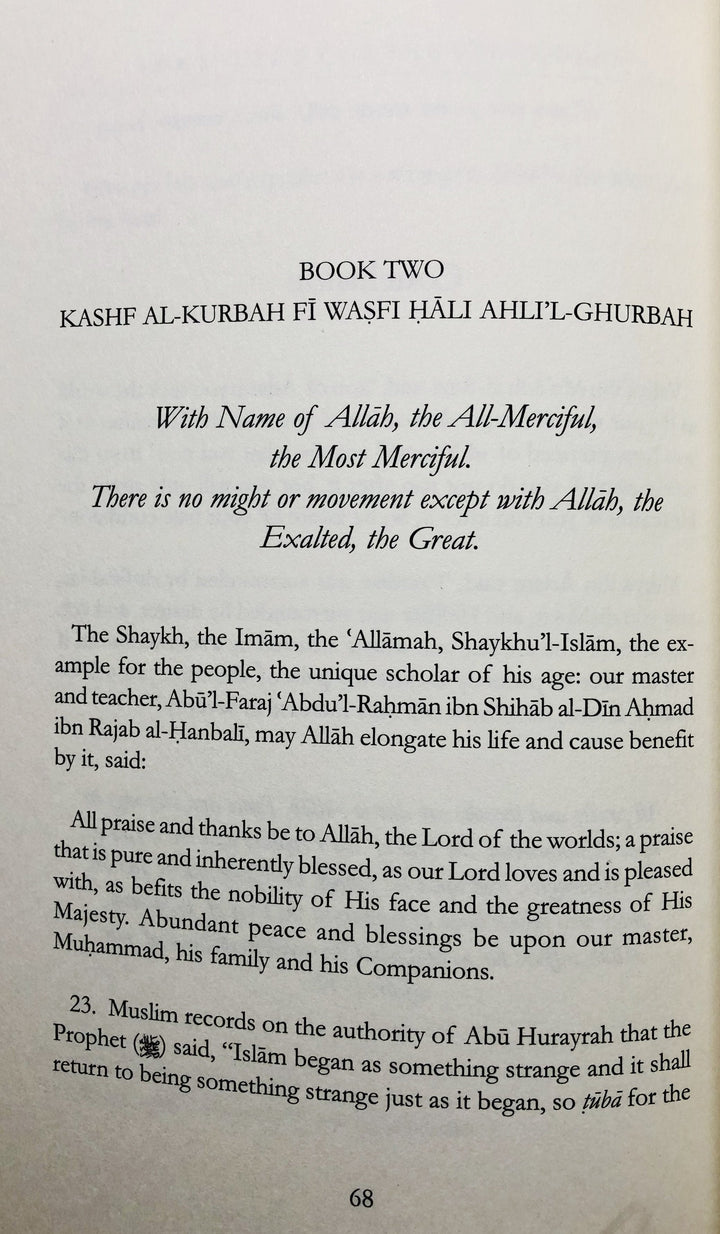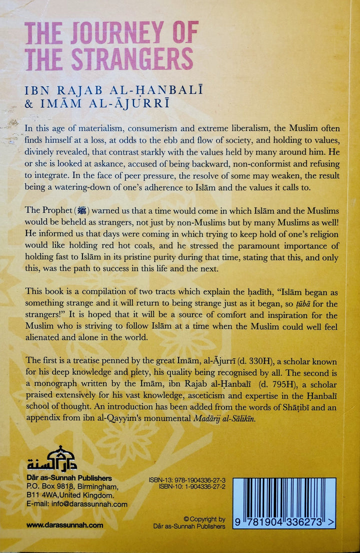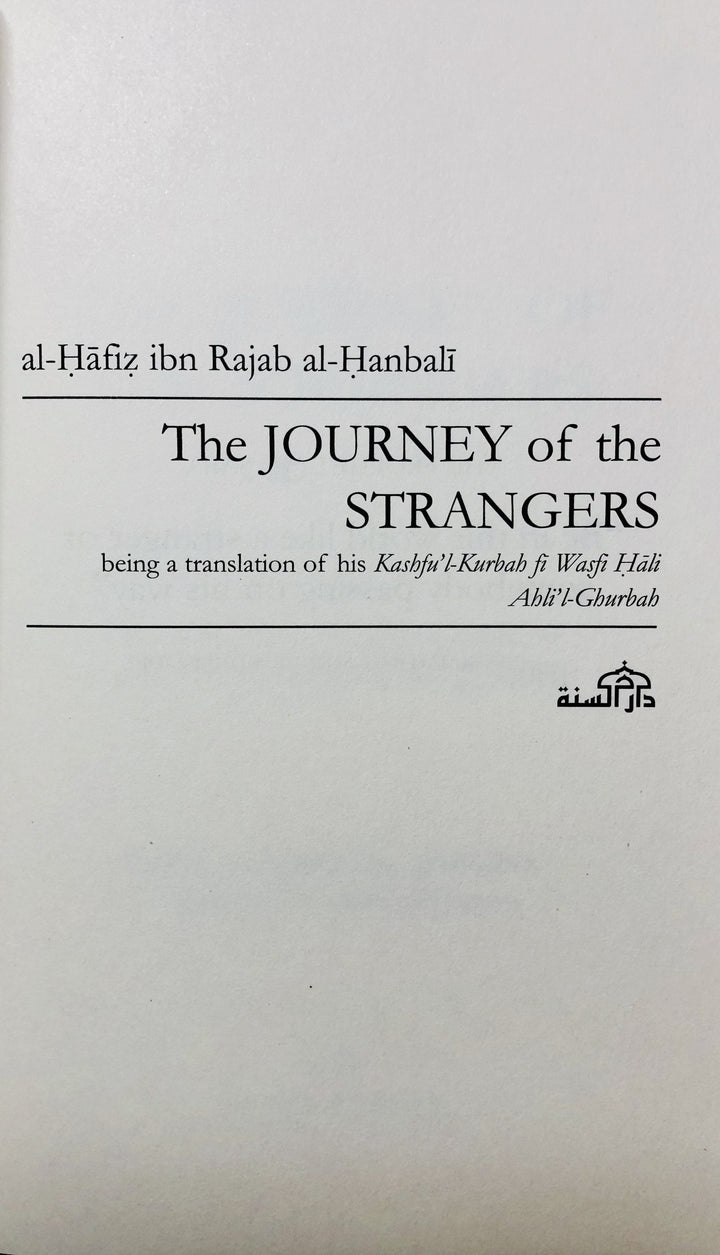 This book Journey Of The Strangers is a compilation of two tracts Kashfu'l-Kurbah fi Wasfi Hali Ahli'l-Ghurabah by Al-Hafidh Ibn Rajab and Sifatu'l-Ghuraba by Imam Abu Bakr al-Ajurri which explain the following hadith narrated from Abu Hurayrah that the Messenger of Allah (Sallallahu Alayhe Wassalam) said,