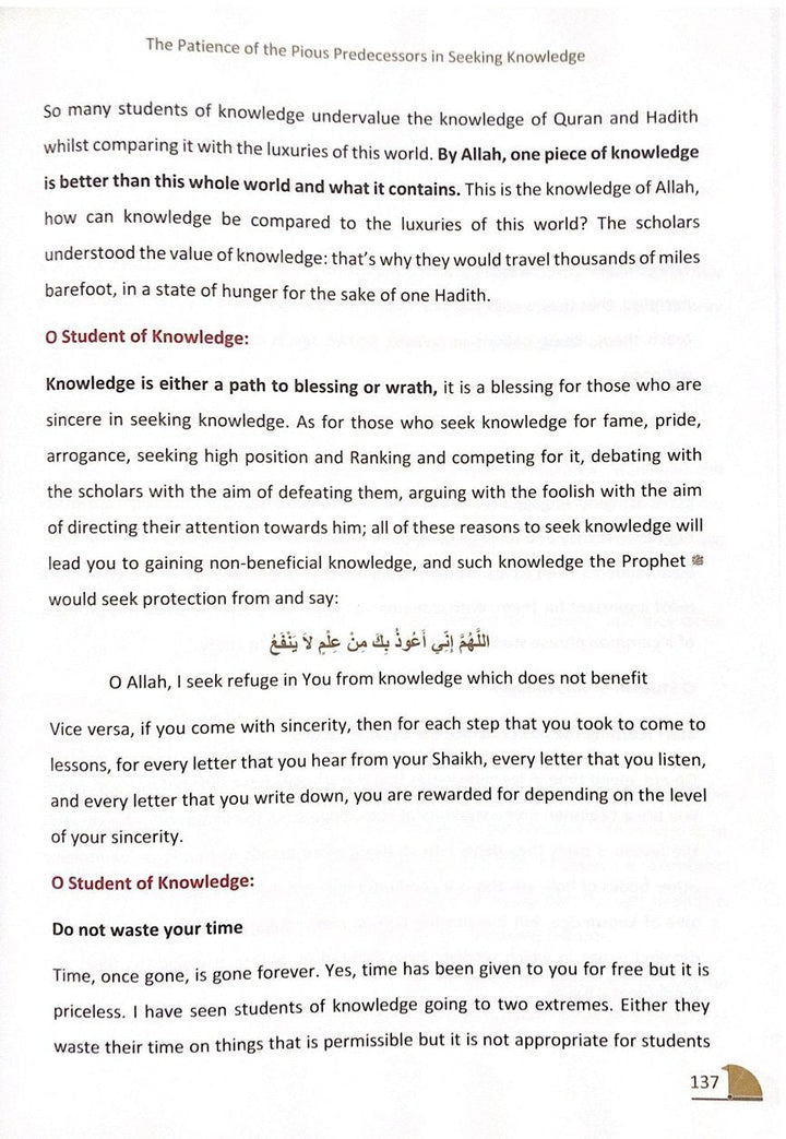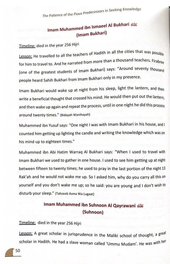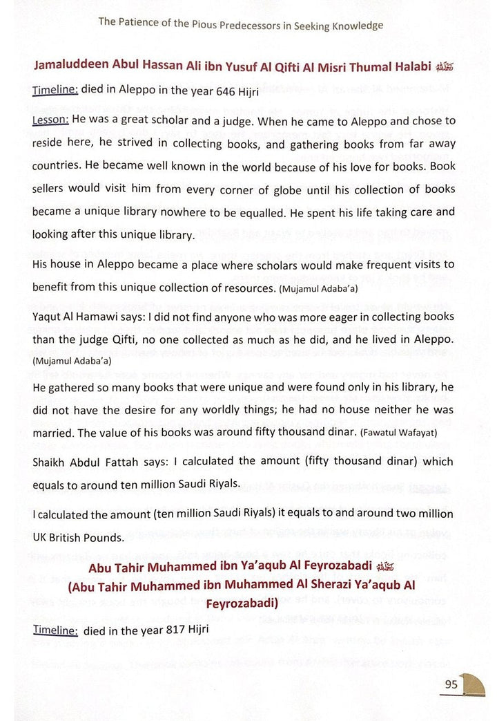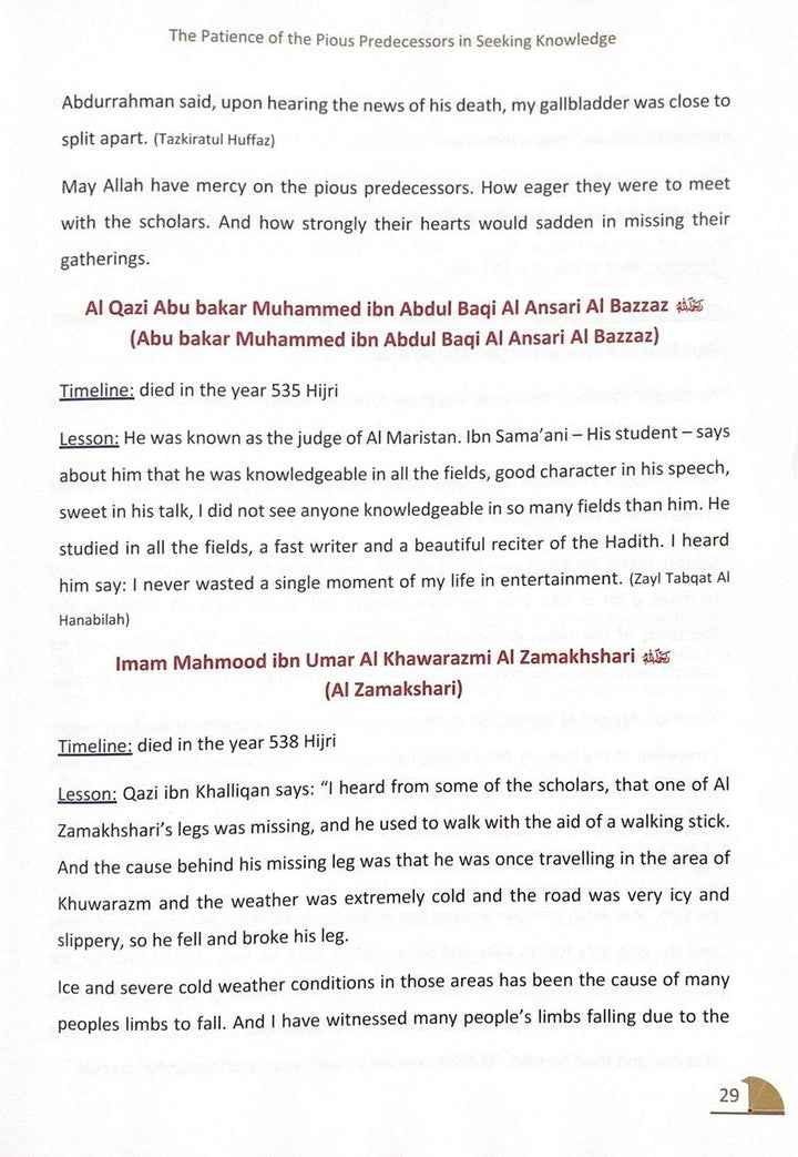 The book will help you come closer to Allah SWT, by realising the patience of the righteous predecessors in their path of seeking knowledge. The stories of the pious predecessors strengthen one's Imaan and are an admonishment for the people who reason as Allah SWT states: