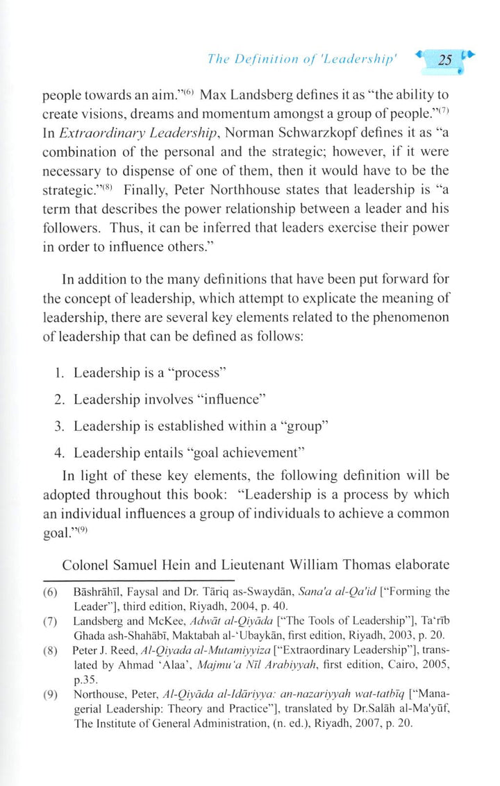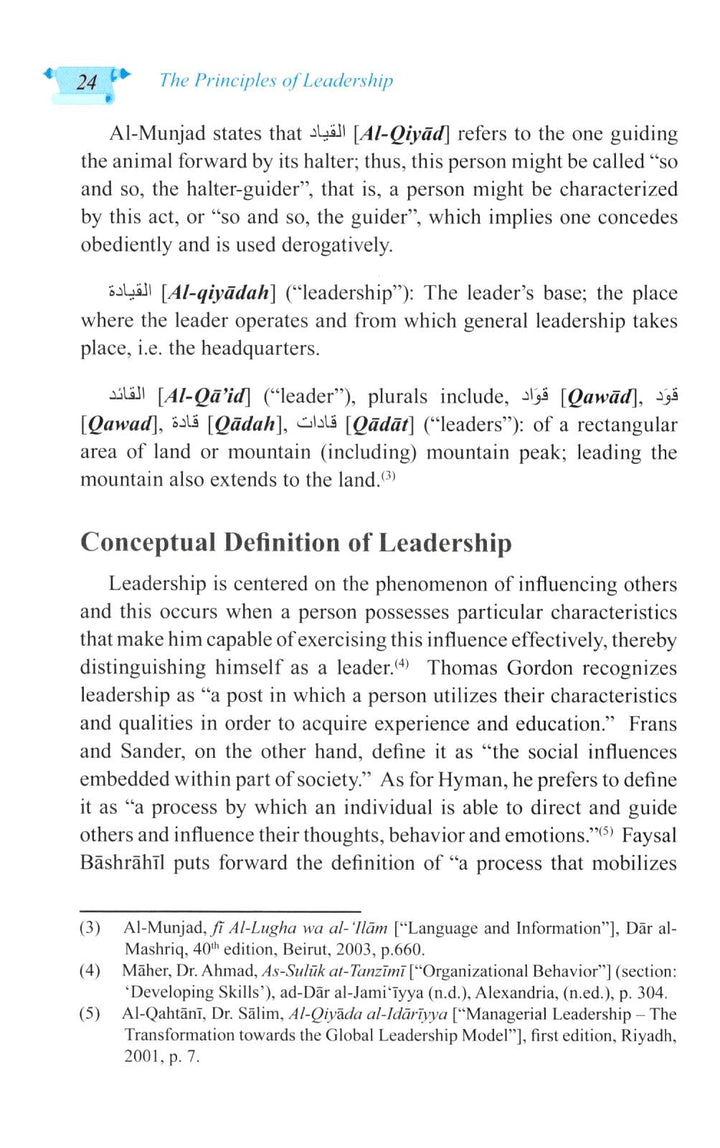 In this work أركان القيادة, Dr. Yusef bin Othman Al-Huzaim offers an insightful awareness of the many theories and practices of leadership deriving from Islamic heritage and the modern American experience. Dr Al Huzaim combines Western management theory and practices with Islamic principles. From an Islamic standpoint, Dr. Al Huzaim does not rely on western philosophy to establish principles of leadership, but he draws on them to demonstrate the vast wealth of literature on the subject (a point he emphasizes to the Arab world for its lack of specialized works in this field) while only tending to draw on those that are in agreement with the truth.