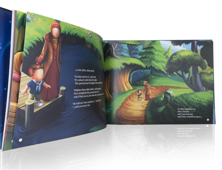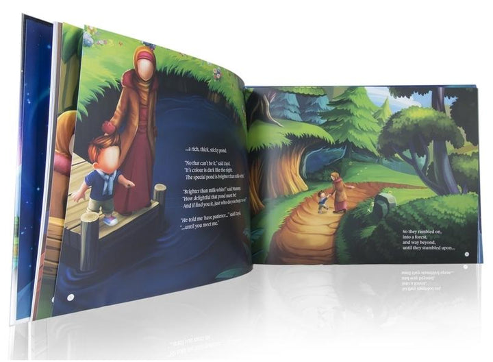 This board book narrates the story of a boy Zayd, who, with the help of his mother, goes in search of a specific pond in the hope of meeting ‘someone special’. He describes one characteristic of the pond with each turn of the page, never quite finding the right pond, until his mother discovers he’s actually talking about a pond from the hereafter. It’s then that the adventure reaches it tear-flowing climax in the realisation that her son longs to meet the Prophet Muhammad (Sallallahu Alayhe Wassalam).