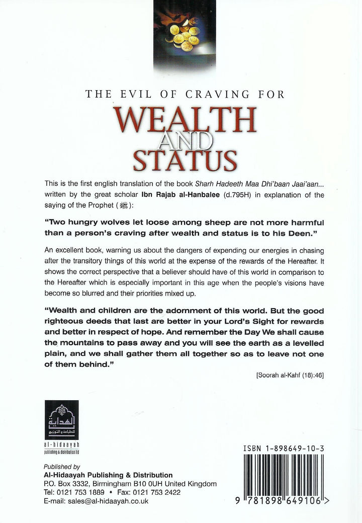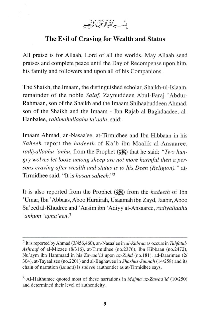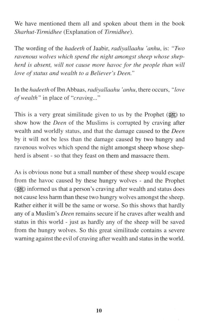 In this book, Ibn Rajab provides an explanation of the hadeeth of the Prophet, in which he said: ‘Two hungry wolves let loose among sheep are not more dangerous than a person’s craving after wealth and status is to his Deen.’