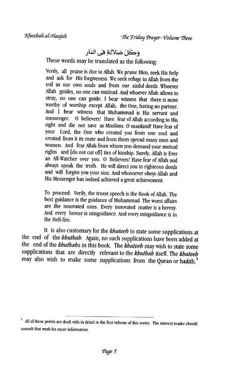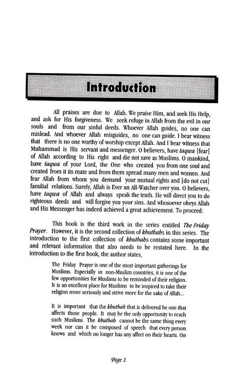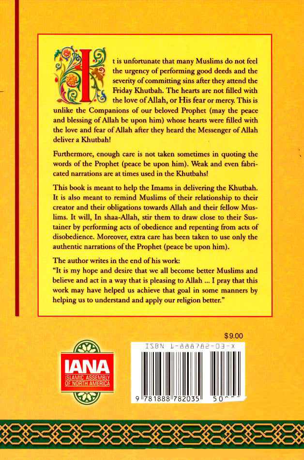 This book is meant to help the Imams in delivering the khutbah. It ia slo meant to remind Muslims of their relationship to their creator and their obligations towards Allah (swt) and their fellow Muslims. It will, insha'Allah, stir them to draw slose to their sustainer by performing acts of obedience and repenting from acts of disobedience. Moreover, extra care has been taken to use only the authentic narrations of the Prophet (pbuh).