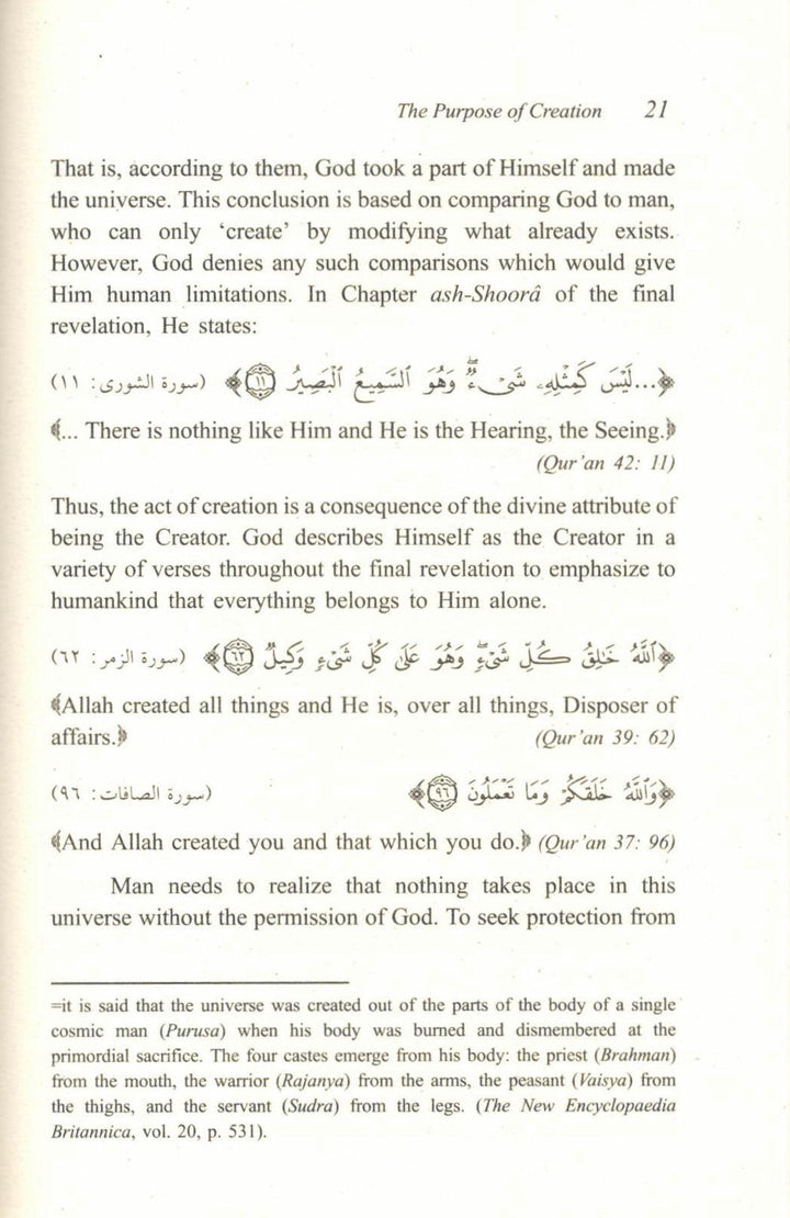The purpose of creation is a topic that puzzles every human being at some point in his or her life. Everybody eventually asks the question, ‘Why do I exist?’ or ‘For what purpose am I here on earth?’ Dr. Bilal Philips examines the attempts by various cultures and religions to answer these questions and compares the scriptures of the major world faiths on this burning issue. The result is a fascinating discussion in a book that you will not want to put down until you reach the last page.