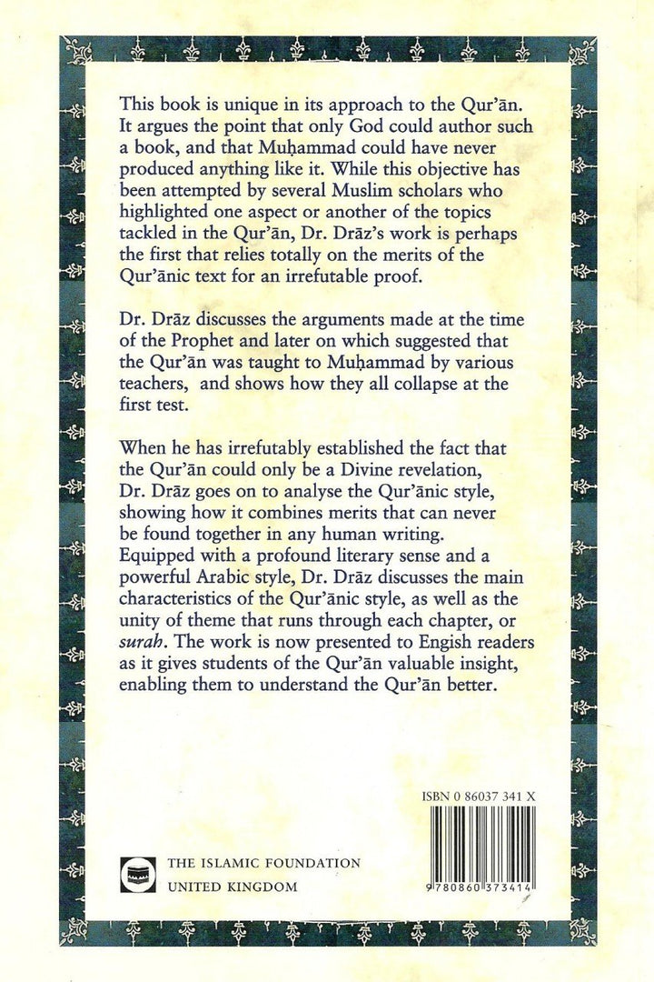 Dr. Draz discusses the arguments made at the time of the Prophet and later on which suggested that the Qur’an was taught to Muhammad by various teachers, and shows how they all collapse at the first test. When he has irrefutably established the fact that the Qur’an could only be a divine revelation, Dr. Draz goes on to analyze the Qur’anic style, showing how it combines merits that could never be found together in any human writing. Equipped with a profound literary sense and a powerful Arabic style, Dr. Draz discusses the main characteristics of the Qur’anic style, as well as the unity of theme that runs through each chapter, or surah. The work is now presented to English readers as it gives students of the Qur’an valuable insight, enabling them to understand the Qur’an better.