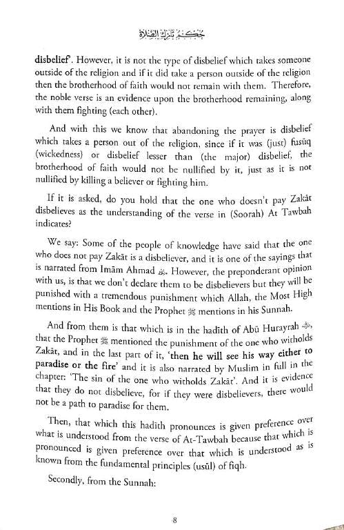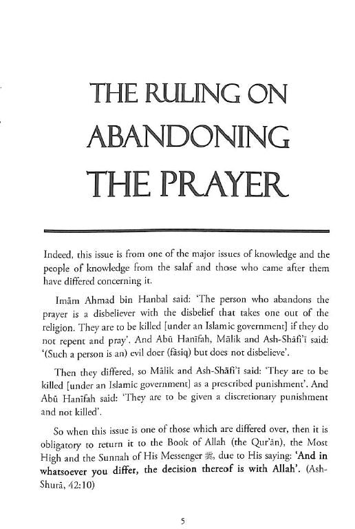 So due to this issue, which is one of the major issues which many people have been put to trail with nowadays, and the difference of opinion concerning it amongst the scholars of this nation and its leaders, both old and new, I wished to write about it which was easy, summarising the speech concerning it, into two sections The first concerning the ruling upon the one who abandons the prayer.