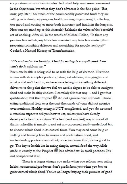 Most importantly, Then And Now offers the solution to taking back control of our health: SIMPLIFY healthy eating by getting back to basics, not following fad diets or food gurus but in getting back to eating whole natural food the way Allah made it and the way the Prophet (Sallallahu Alayhe Wassalam) ate it. This simple key opens the door to connecting our food choices to our desire to please our Creator and to taking care of the body with which He has blessed us, clearing the way to health and energy and elevating our choices regarding food to acts of worship.