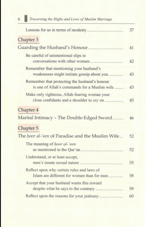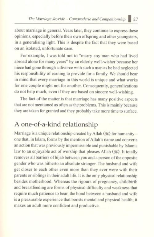 Transcending the cultural bounds that hinder the smooth transition of couples into married life and abolishing stereotypes, the book offers up-to-date, wide-ranging marital advice based on an impressive amount of carefully compiled and well-presented information based on the Quran and the Sunnah. It will prove to be your key towards making marriage a joyful and wonderful experience all the way!