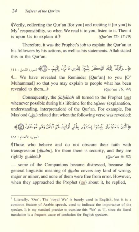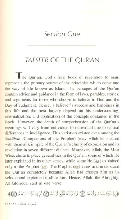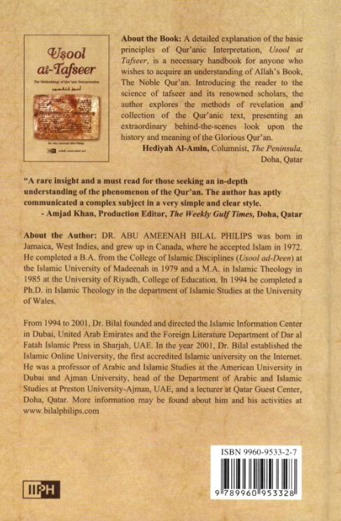 The title of this book, Usool at-Tafseer (literally, ‘The Fundamental Principles of Qur’anic Interpretation’), essentially refers to the branches of knowledge necessary for providing an accurate interpretation of the Qur’anic texts, such as Arabic grammar and syntax, Arabic literature, and Qur’anic sciences (‘Uloom al-Qur’ân). Familiarity with modern fields of learning, like the pure sciences and social sciences, is also necessary for a commentator in this era to make the Qur’anic explanations relevant to modern human society. Usool at-Tafseer addresses the actual step-by-step methodology of interpreting the Qur’an to ensure that interpretations are not merely the result of human whims and fancies. These subjects were traditionally mentioned in the books of usool al-fiqh (the fundamental principles of Islamic Law) and the introductions to the classical books of tafseer. The core material for this book was taken from the excellent work Mabâhith fee ‘Uloom al-Qur’ân, by Shaykh Mannâ‘ al-Qattân. However, supplementary material was also gathered from other classical and current works on the subject, as the footnotes clearly indicate. Those chapters of particular relevance to the English-speaking reader were chosen, while others which include Arabic linguistic issues beyond the comprehension of the average reader were not included.