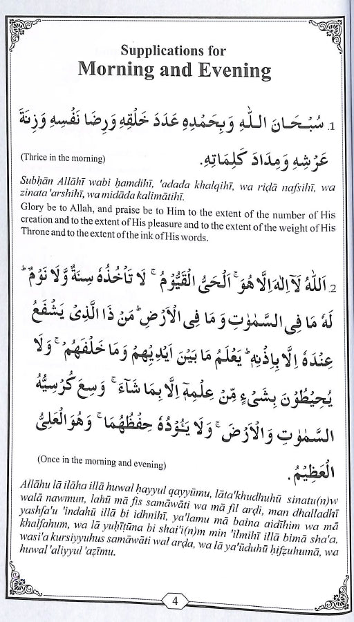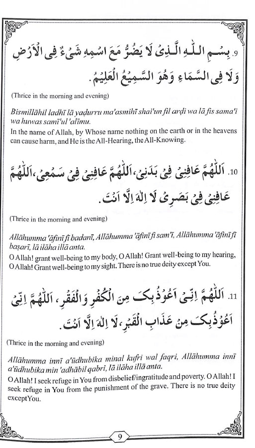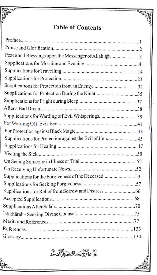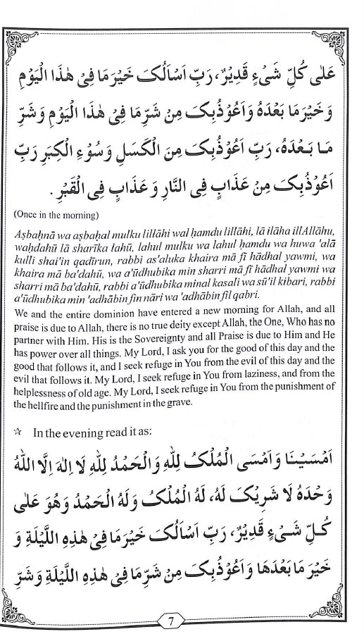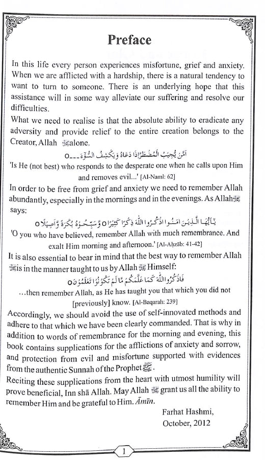 This book is a compilation of words of remembrance for the morning and evening, along with supplications for the afflictions of anxiety and sorrow, and protection from evil and misfortune supported with evidence from the authentic Sunnah of the Holy Prophet (S.A.W)