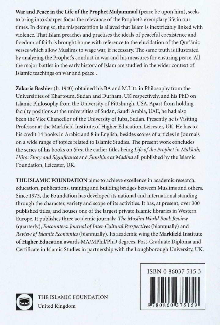 War and Peace in the Life of the Prophet Muhammad (peace be upon him), seeks to bring into sharper focus the relevance of the Prophets exemplary life in our times. In doing so, the misperception is allayed that Islam is inextricably linked with violence. That Islam preaches and practices the ideals of peaceful coexistence and freedom of faith is brought home with reference to the elucidation of the Qur’anic verses which allow Muslims to wage war, if necessary. The same truth is illustrated by analyzing the Prophets conduct in war and his measures for ensuring peace. All the major battles in the early history of Islam are studied in the wider context of Islamic teachings on war and peace.