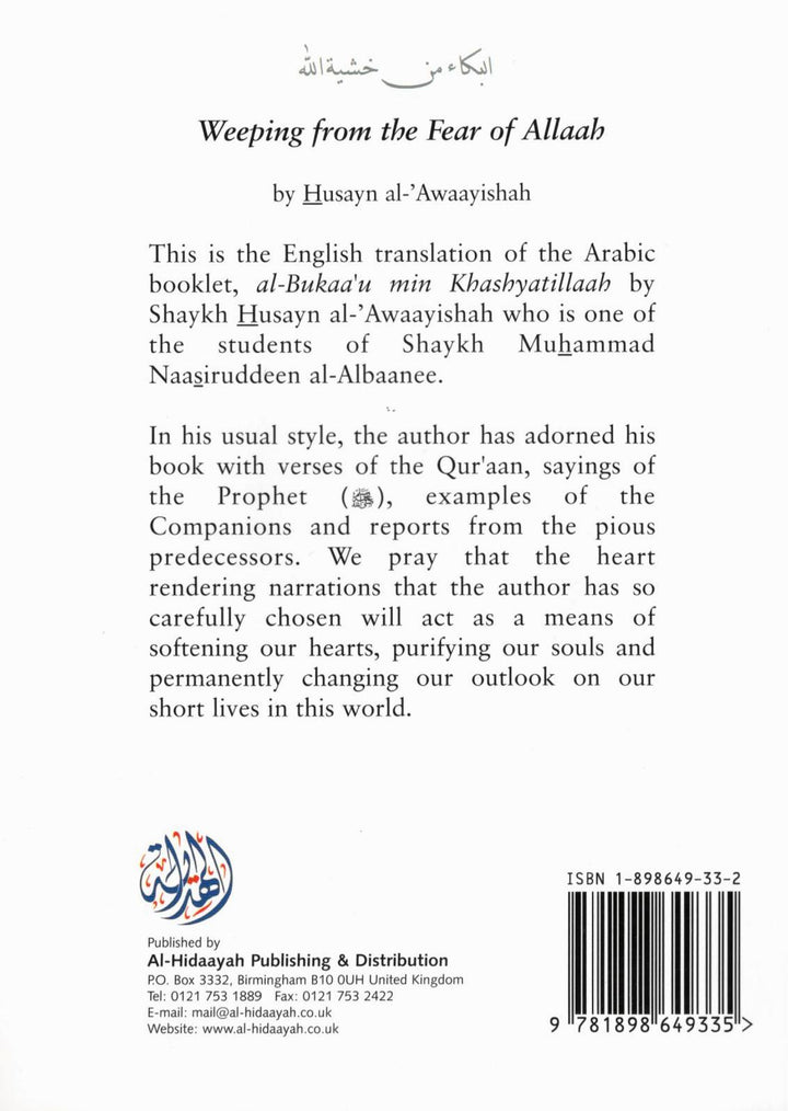 This is a very moving book on the topic of crying out of fear of Allaah. It is being presented at a time when crying is considered a weakness rather than a virtue – and this has lead to the hardness of the hearts. The author brings narrations from the Prophet as well as many Companions as examples of weeping from the fear of Allaah. The book also has a section containing many practical points on ways and means of developing this noble quality of weeping due to the fear of Allah.