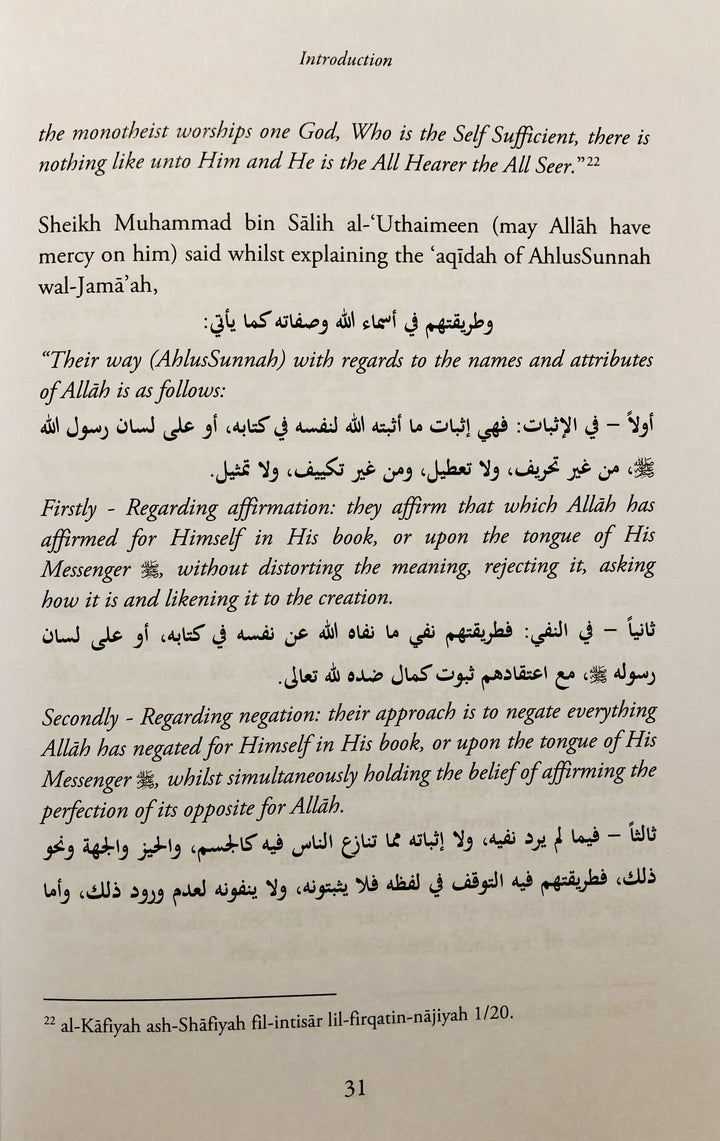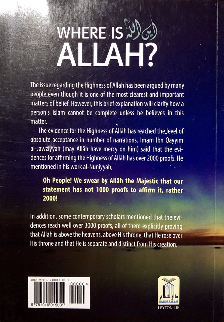 This book Where Is Allah ? : A Commentary and Analysis In Light Of The Quran and Sunnah is a brief explanation, which clarifies how a person’s Islam cannot be complete unless he believes in this matter. This book despite being concise, is full of benefits and filled with evidences from the Quran and Sunnah, statements of the earlier scholars and the views of the four imams of the madhahib. This book has been approved and recommended by Shaykh Khalid bin 'Abdullah Al-'Afefi, who is a student of the renowned Saudi scholar Allamah Muhammad bin Saleh Al-Uthaymeen (r).