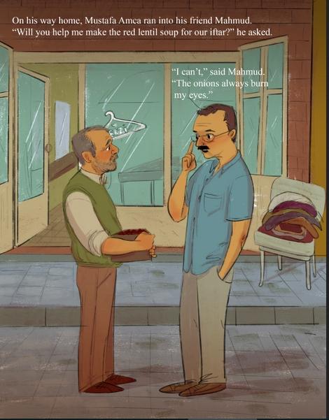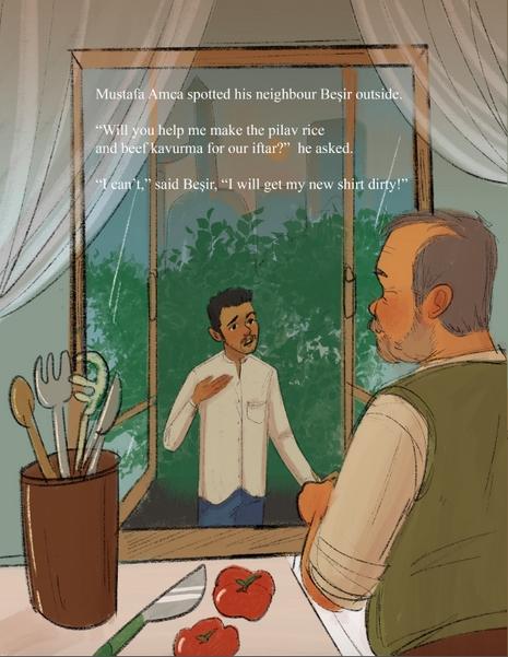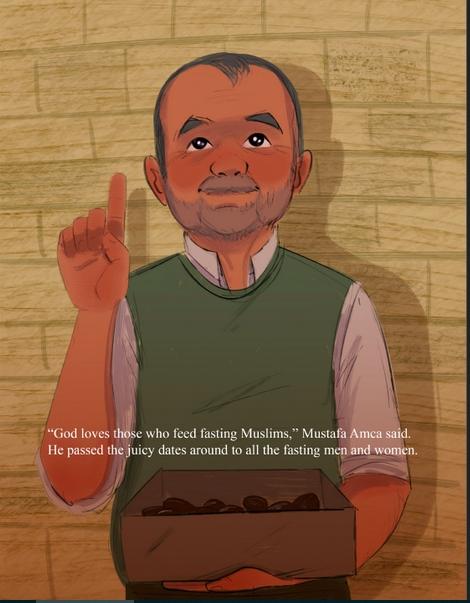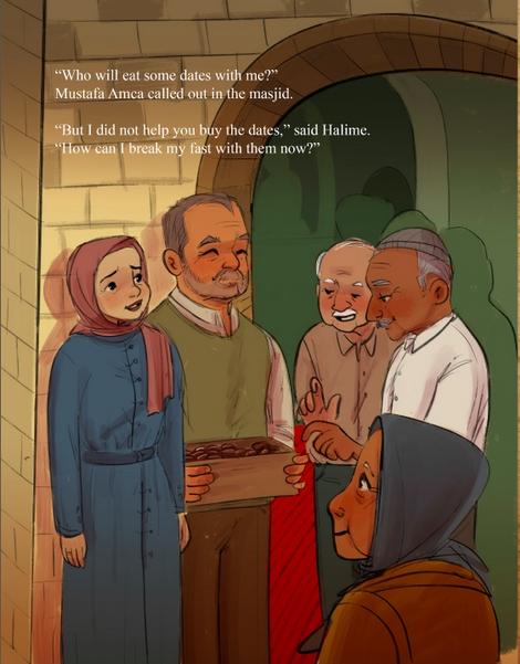 When iftar time arrives, he offers sweet dates to those at the masjid and invites everyone to come to his courtyard to break their fasts together. At iftar time, once the food is ready to be served, everyone feels too guilty to eat since they haven't contributed to the iftar. Mustafa Amca kindly reminds them that Allah loves those who are generous with their loved ones and the needy, thus he always wants to be loved by Allah. This motivates everyone to join the delicious meal and participate in the after-dinner clean up and take the leftovers to the poor!