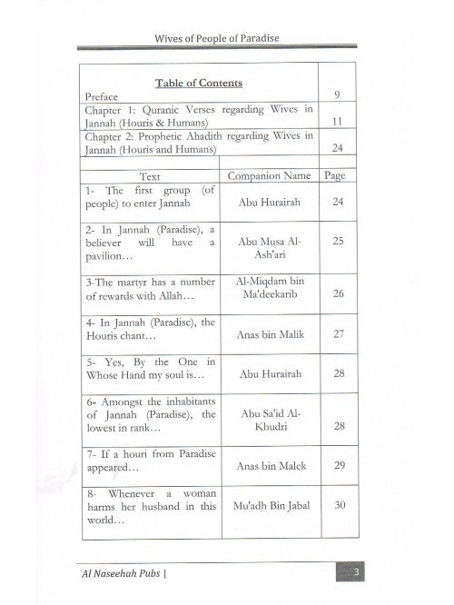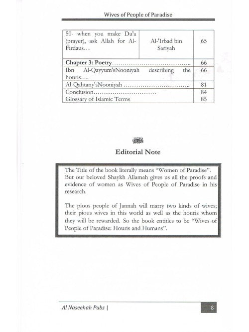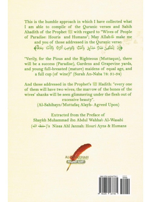 This is humble approach in which I have collected what I am able to compile of the Quranic verses and Sahih Ahadith of the prophet ¿ with regard to " Wives of People of Paradise: Houris and Humans"; May Allah¿ make me and you of those addressed in the Quranic verse: "Verily, for the Pious and the Righteous (Muttaqun), there will be a success (Paradise), Gardens and Grapevine yards, and young full-breasted (mature) maidens of equal age, and a full cup (of wine)!" (Surah An-Naba 78: 31-34)And those addressed in the prophet's ¿ Hadith: "every one of them will have two wives; the marrow of the bones of the wives' shanks will be seen glimmering under the flesh out of excessive beauty". (Al-Sahihayn/Muttafaq Alayh- Agreed Upon)