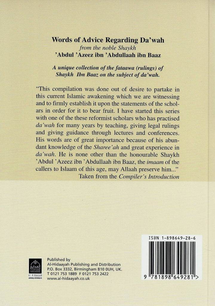 A unique collection of fatawa by the noble Sheikh Bin Baaz on the subject of da’wah. This book clearly illustrates the vast experience, the deep wisdom and the expansive knowledge of the author. This discourse should prove to be beneficial to every Muslim but indispensable for those engaged in da’wah activities. The reader will find that the book addresses many practical points and contains answers to questions that often arise concerning da’wah.