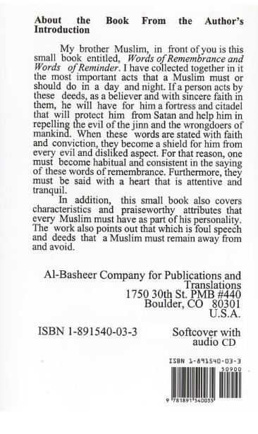 In addition, this concise book also covers characteristics and praiseworthy attributes that every Muslim must have as part of his personality. The work also points out that which is foul speech and deeds that a Muslim must remain away from and avoid. This book is translated, transliterated and accompanied with an audio CD to facilitate memorisation and correct pronunciation of Du'as and Adhkaar.